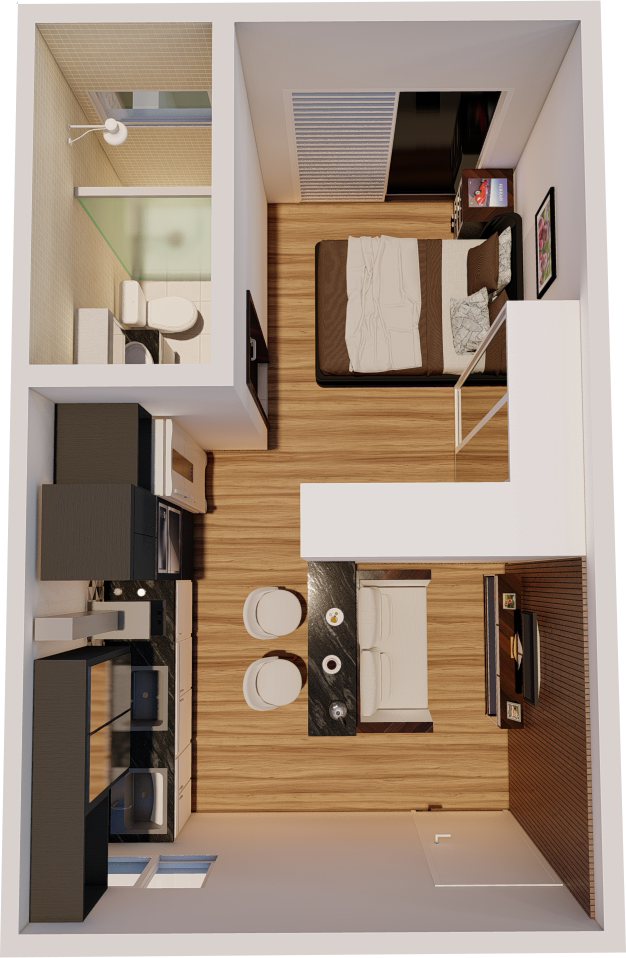 Descrição: Edifício residencial de kitnets com 2 pavimentos, com estacionamento amplo, 7 unidades dotadas de banheiro individual, quarto, cozinha e sala de estar.