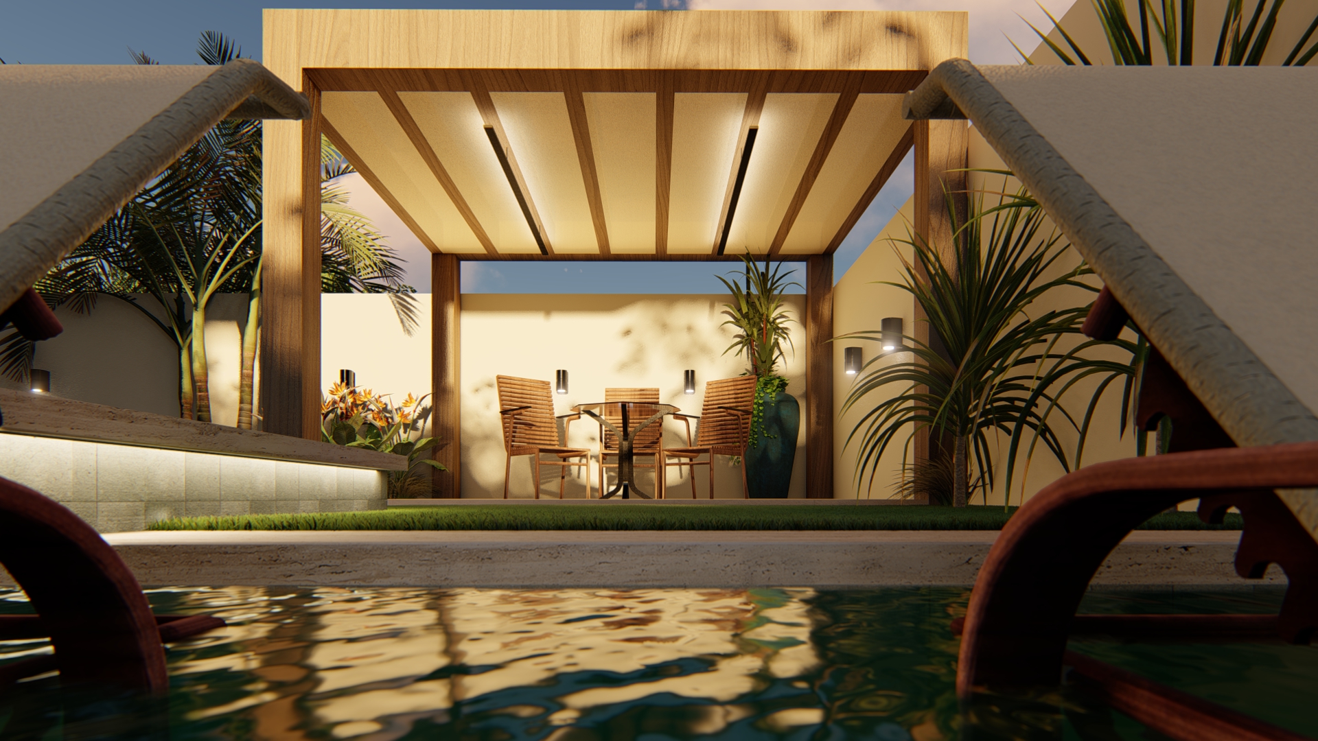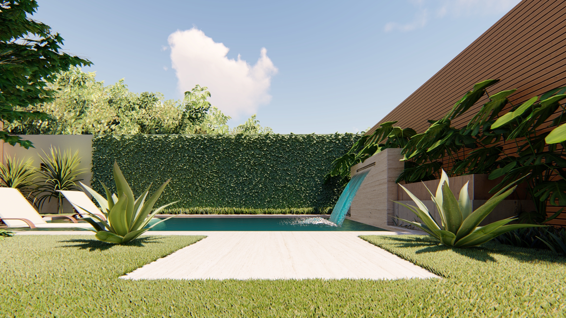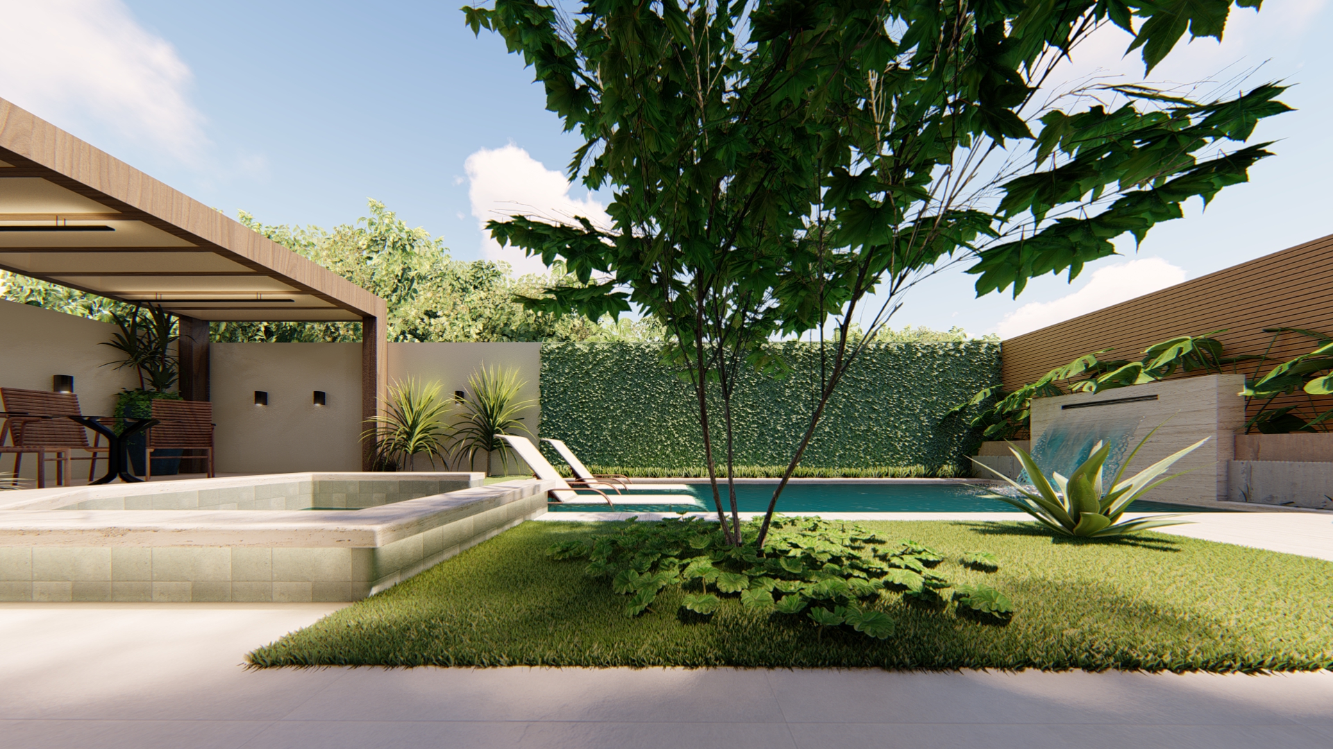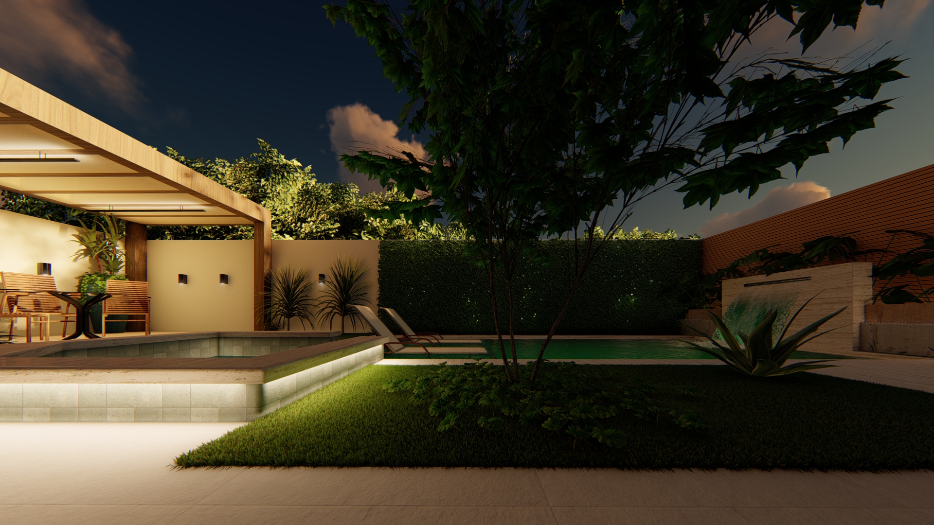 Descrição: Ampliação de residência pela construção de pergolado, piscina com spa e cascata.