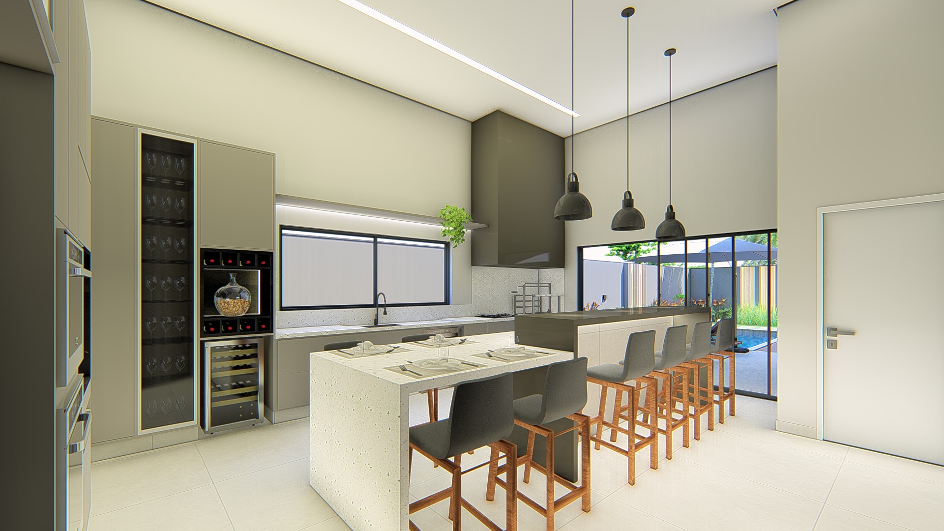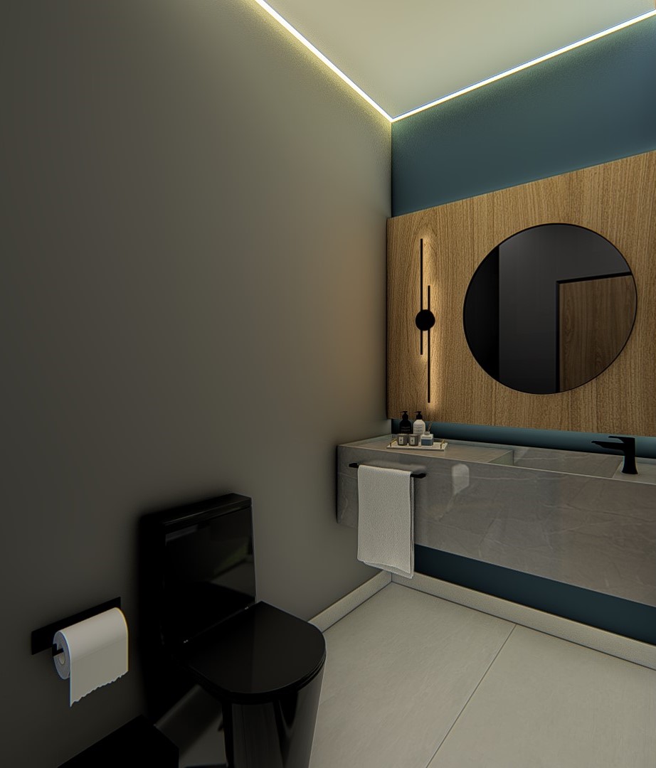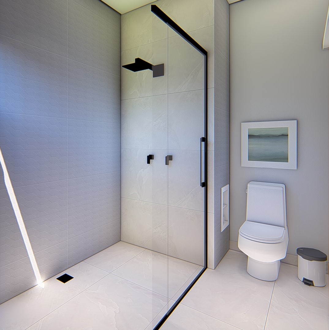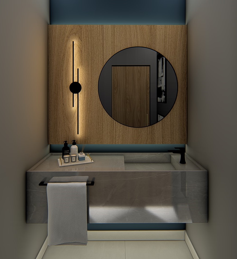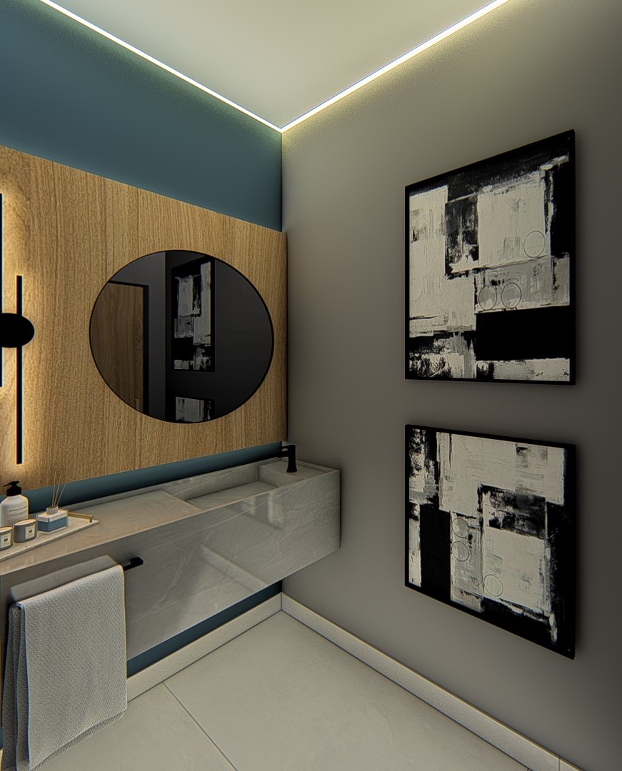 Descrição: Projeto arquitetônico e de design de interiores, incluindo detalhamentos de marcenaria, marmoraria e iluminação, para diversos ambientes da residência, como cozinha, lavabos, lavanderia, sala de TV e suítes.