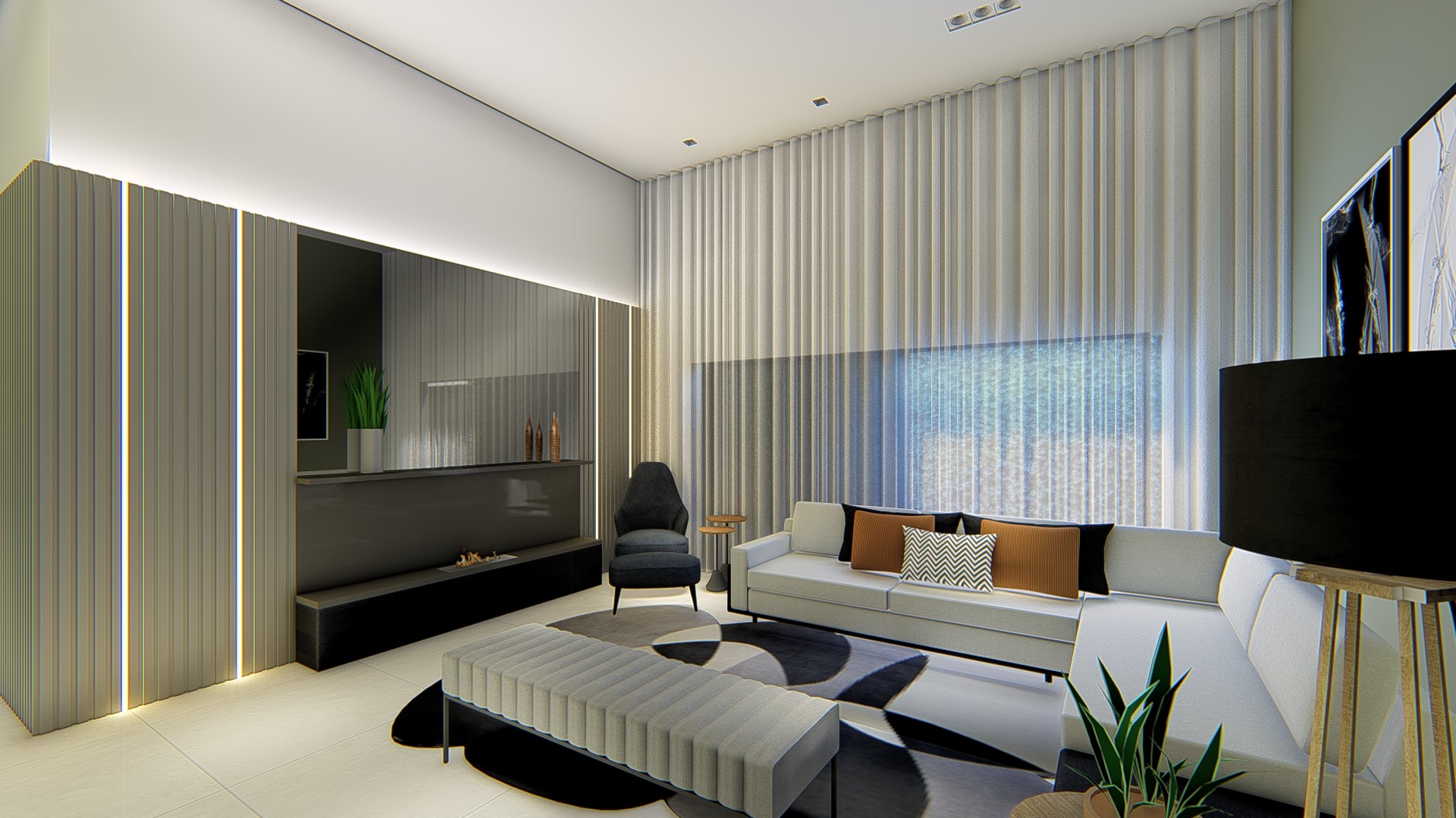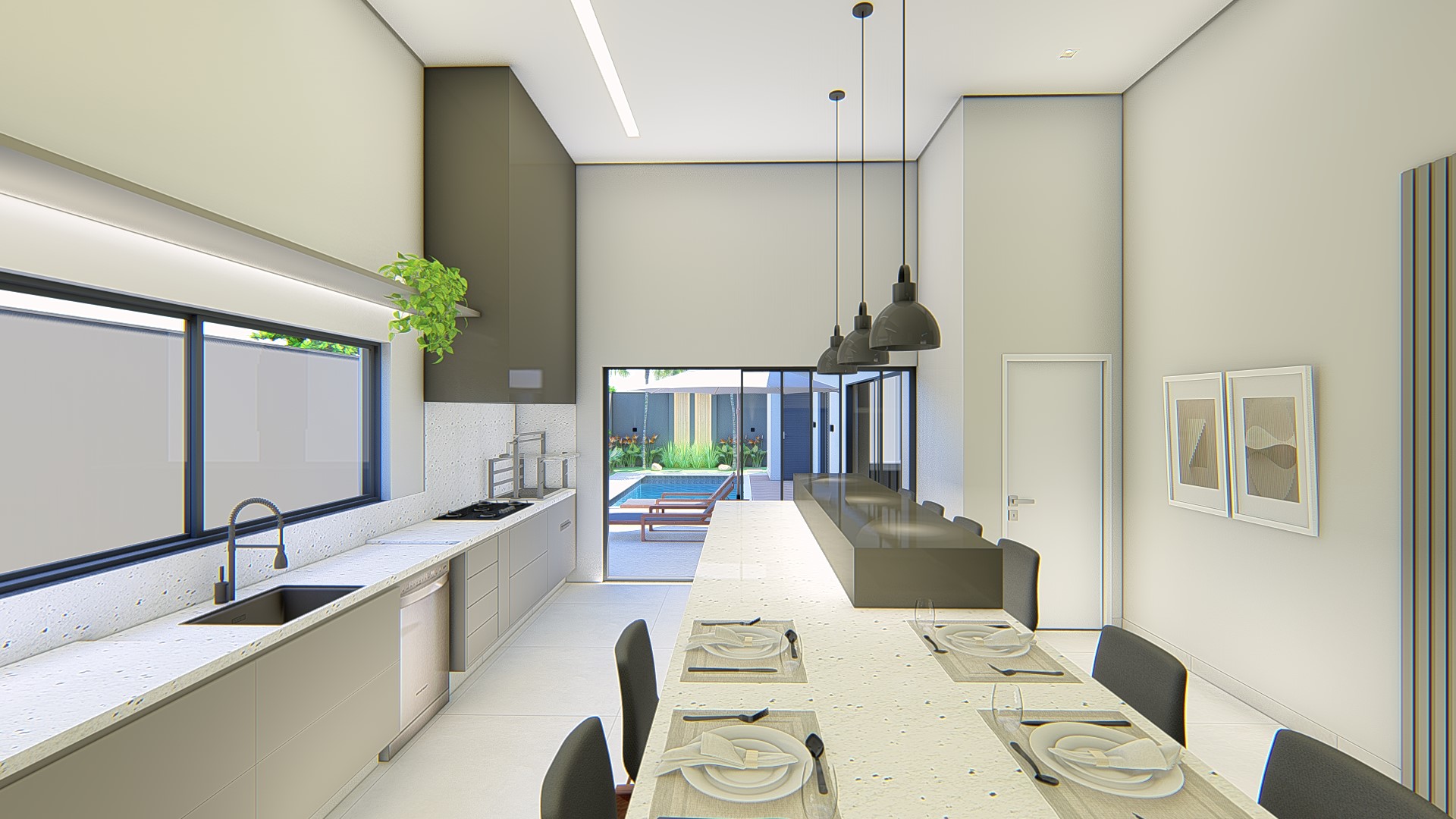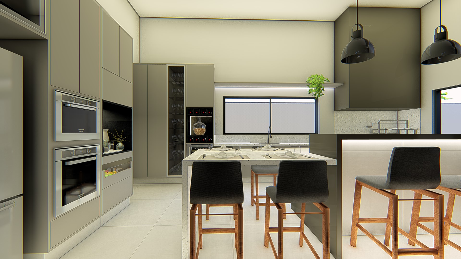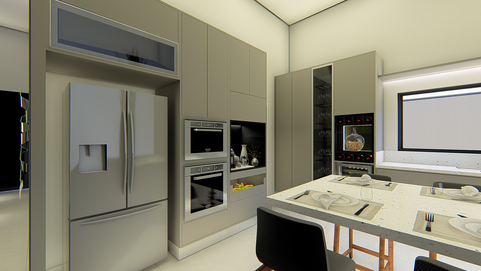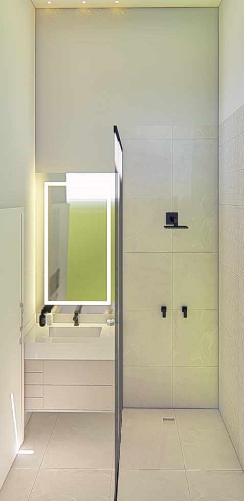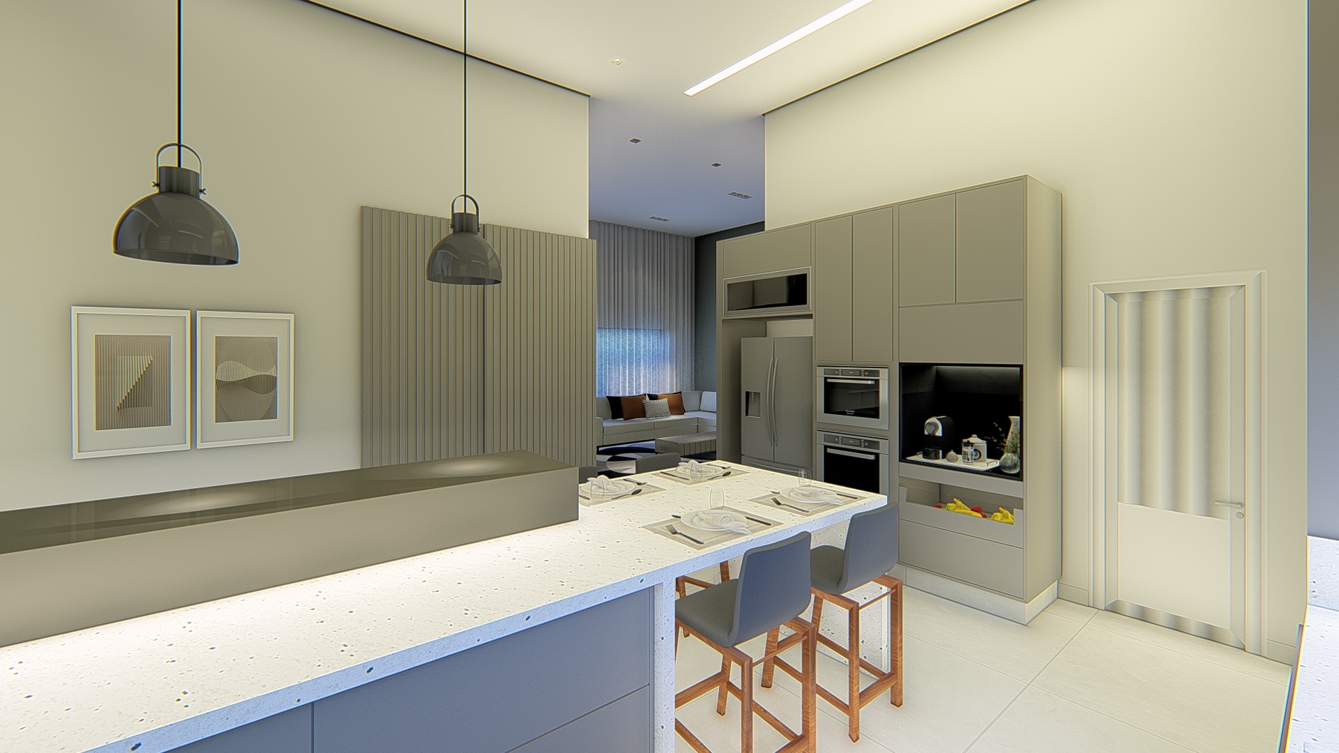 Descrição: Projeto arquitetônico e de design de interiores, incluindo detalhamentos de marcenaria, marmoraria e iluminação, para diversos ambientes da residência, como cozinha, lavabos, lavanderia, sala de TV e suítes.
