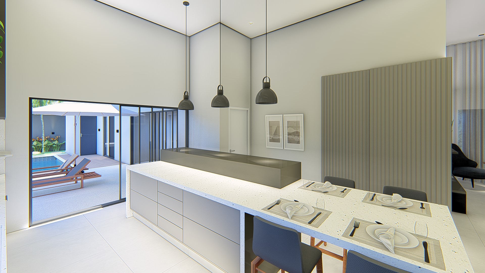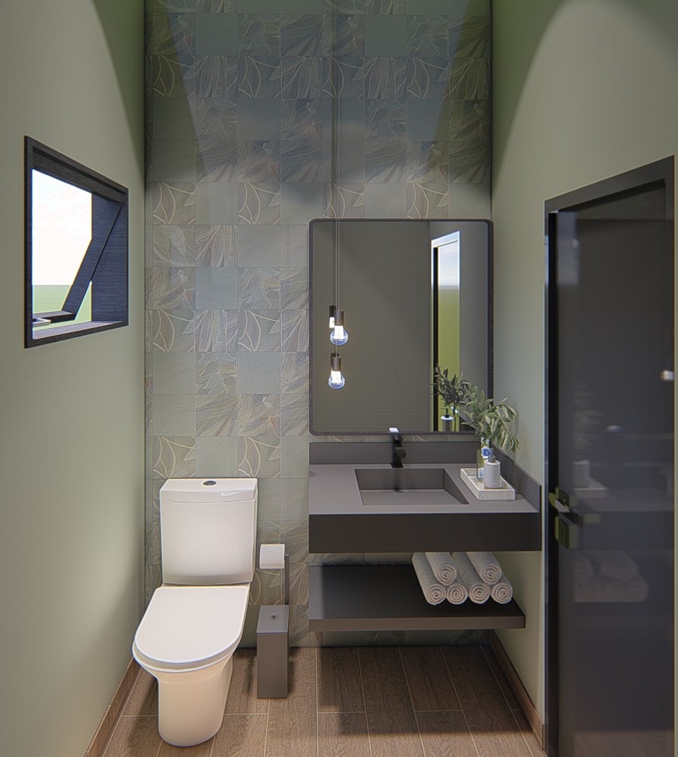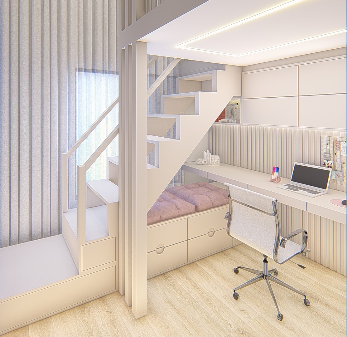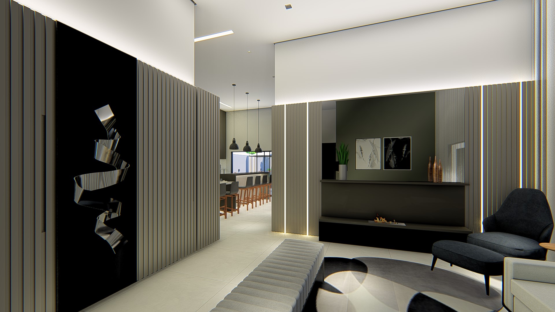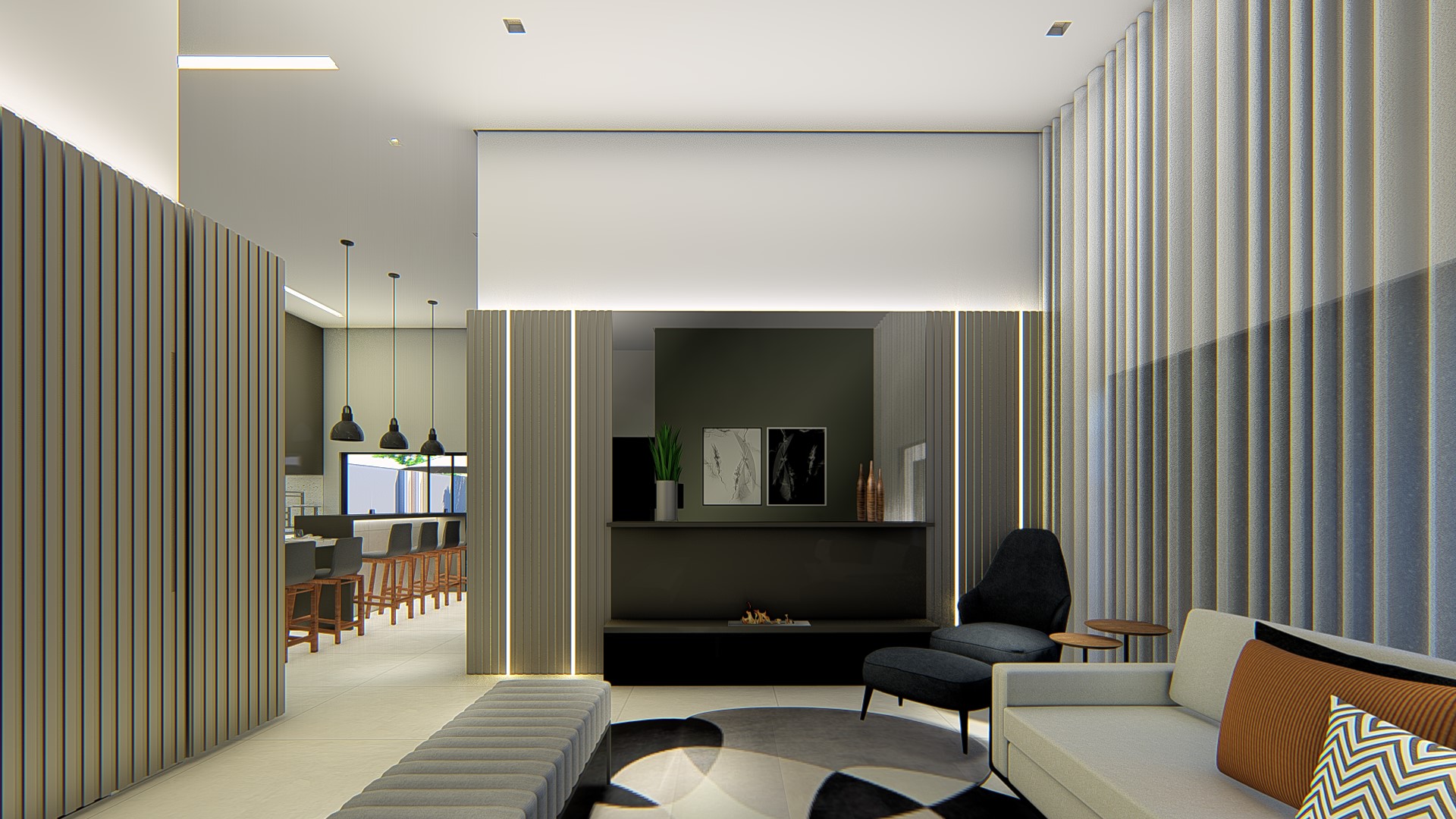 Descrição: Projeto arquitetônico e de design de interiores, incluindo detalhamentos de marcenaria, marmoraria e iluminação, para diversos ambientes da residência, como cozinha, lavabos, lavanderia, sala de TV e suítes.