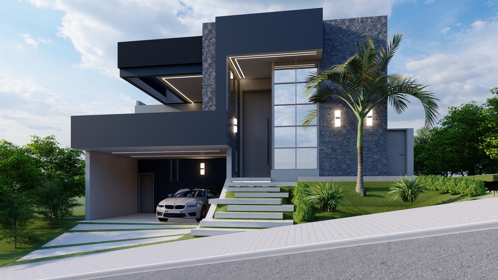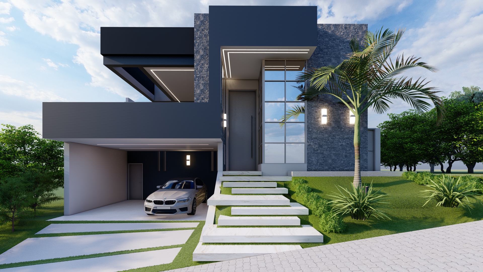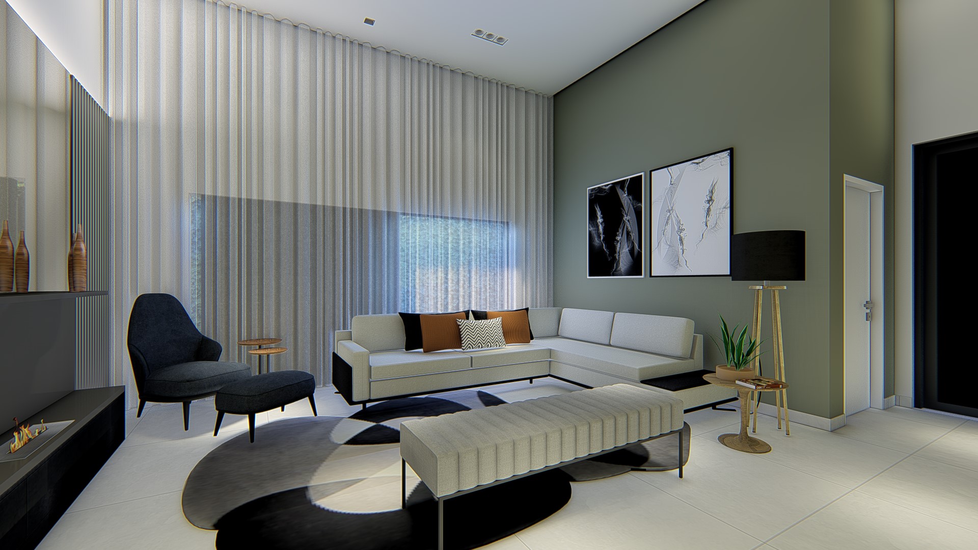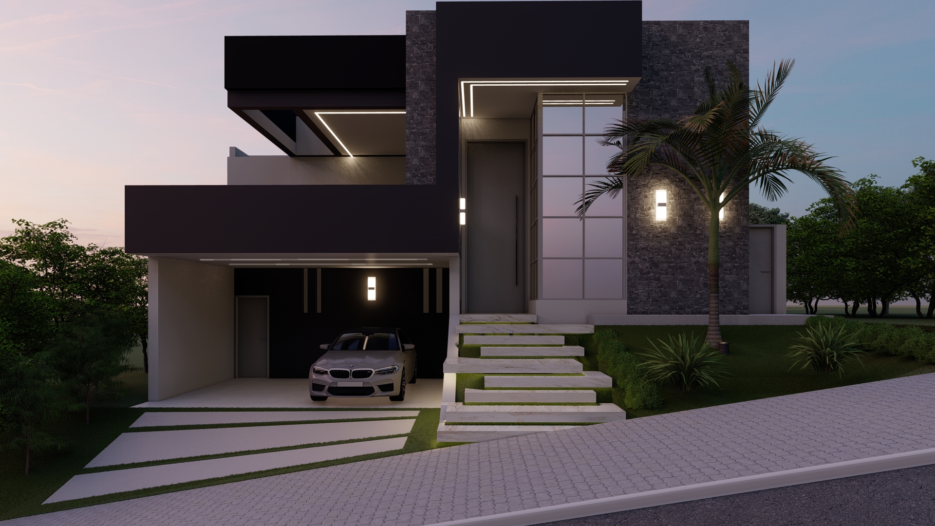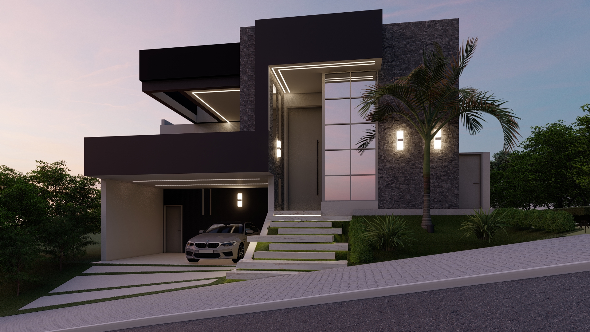 Descrição: Projeto arquitetônico e de design de interiores, incluindo detalhamentos de marcenaria, marmoraria e iluminação, para diversos ambientes da residência, como cozinha, lavabos, lavanderia, sala de TV e suítes.