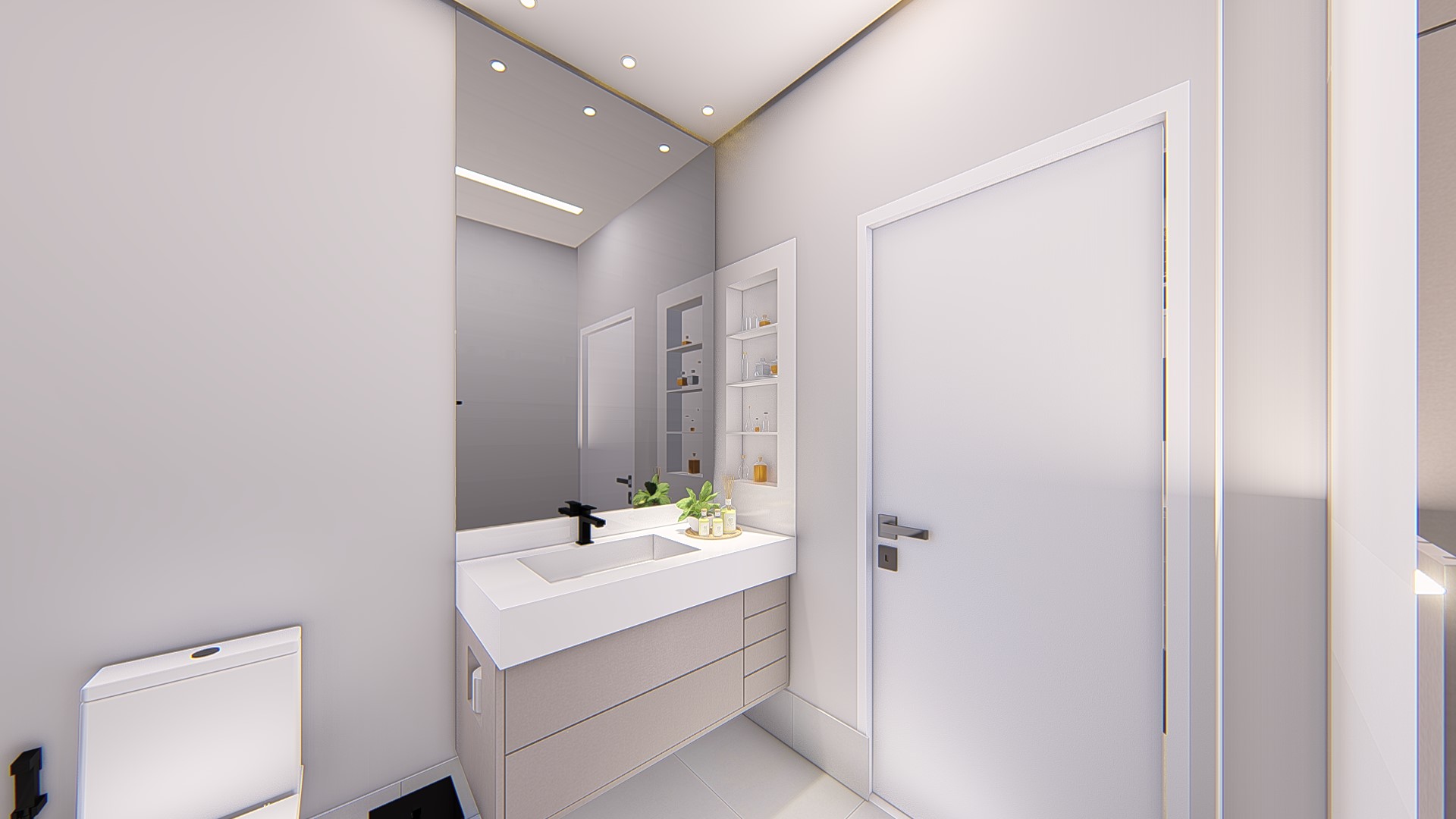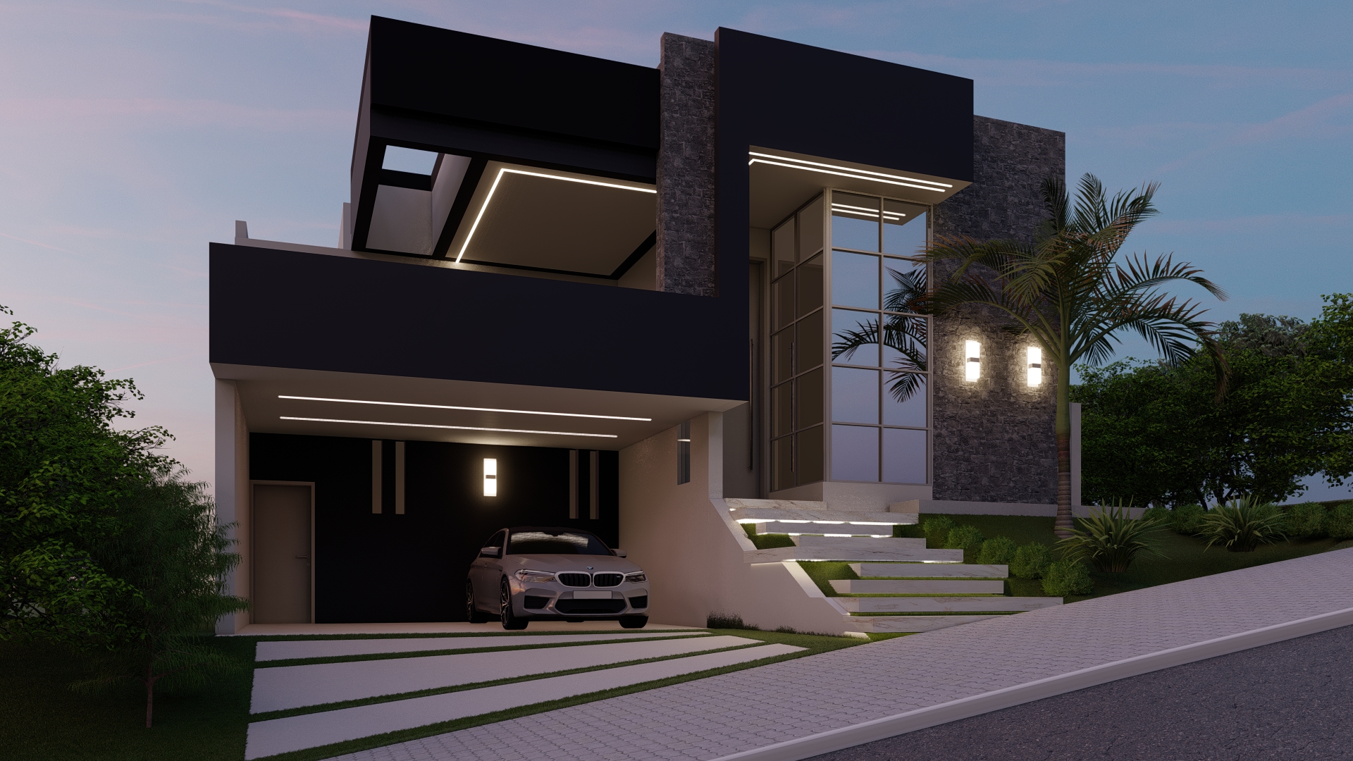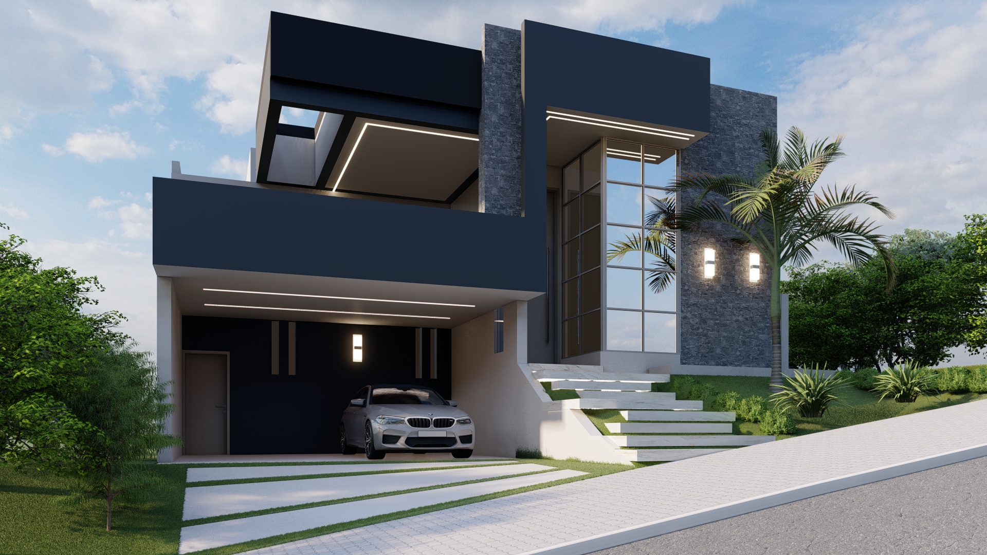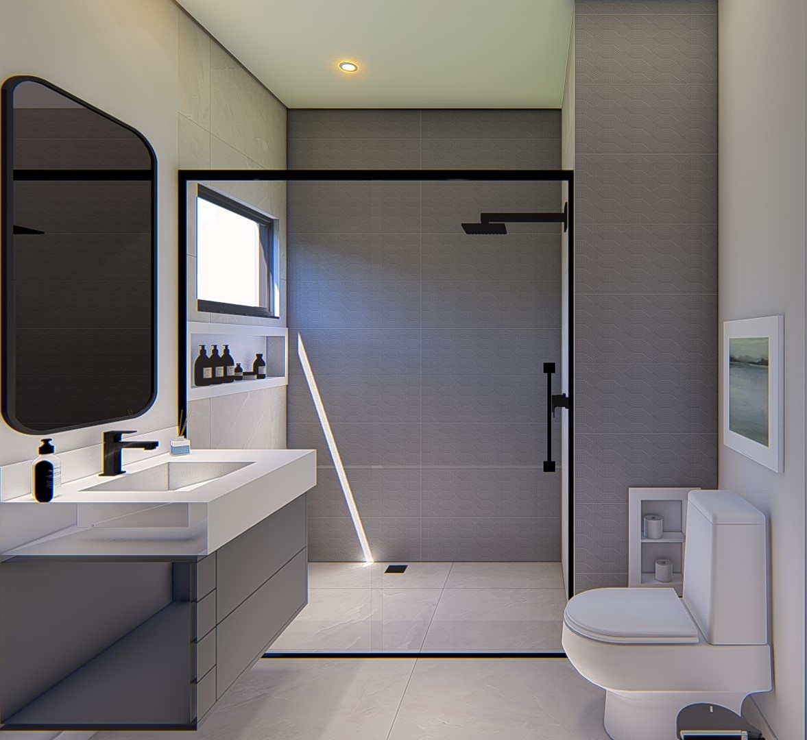 Descrição: Projeto arquitetônico e de design de interiores, incluindo detalhamentos de marcenaria, marmoraria e iluminação, para diversos ambientes da residência, como cozinha, lavabos, lavanderia, sala de TV e suítes.
