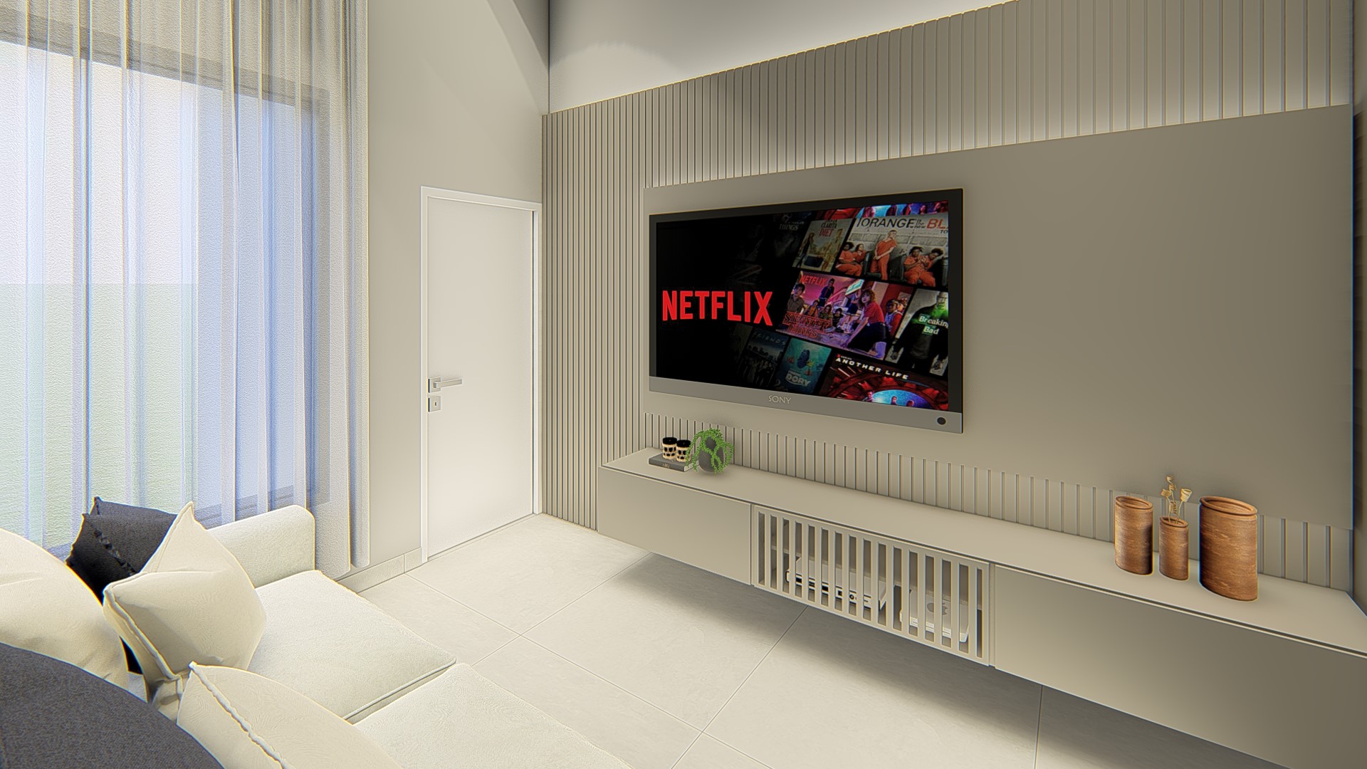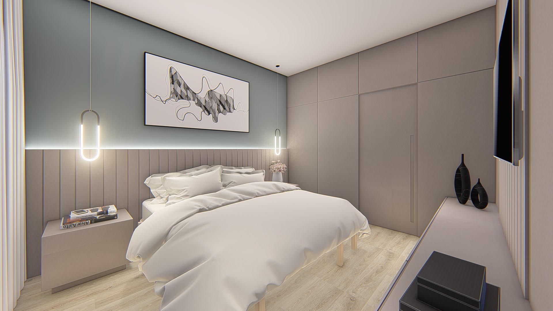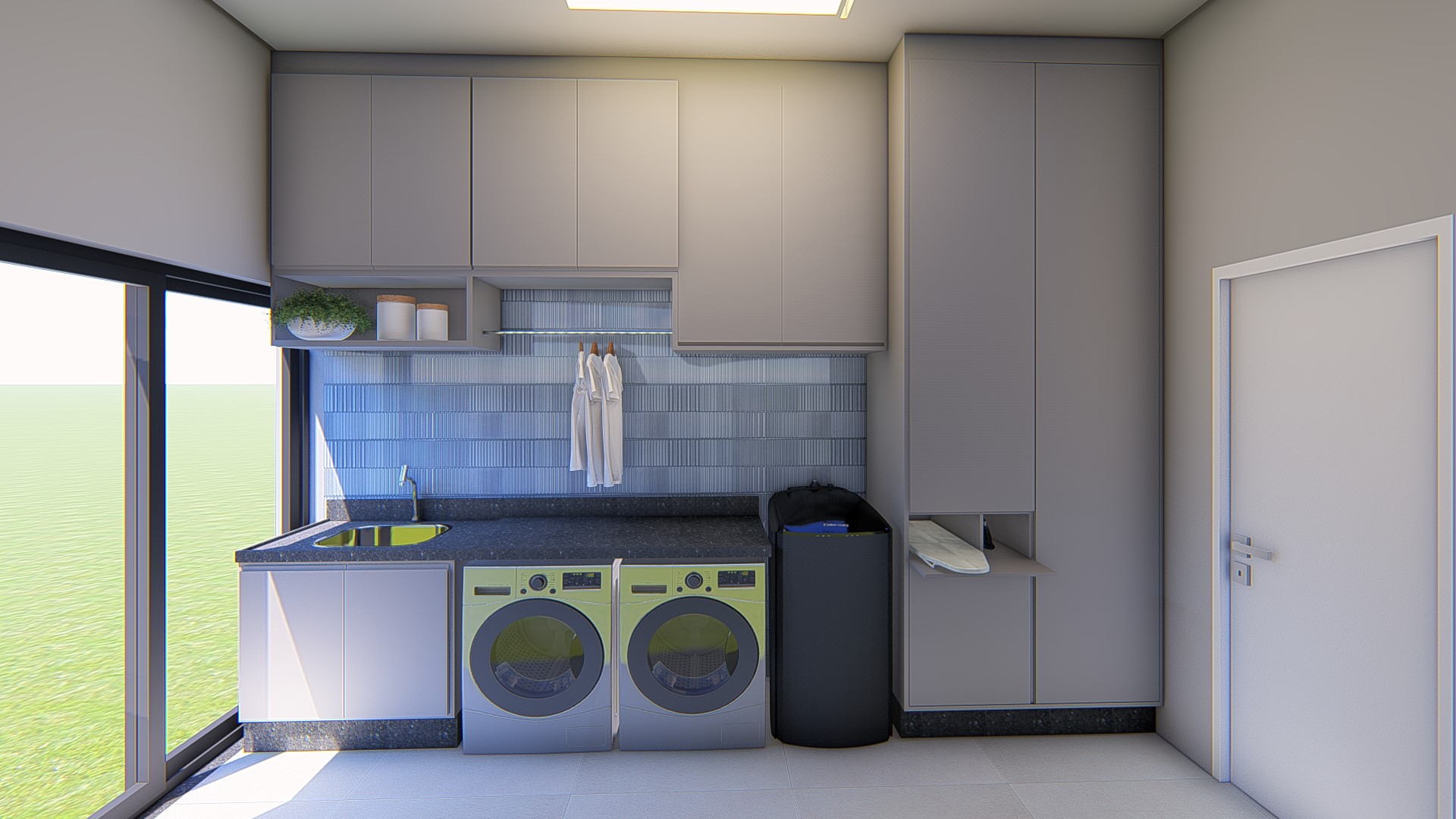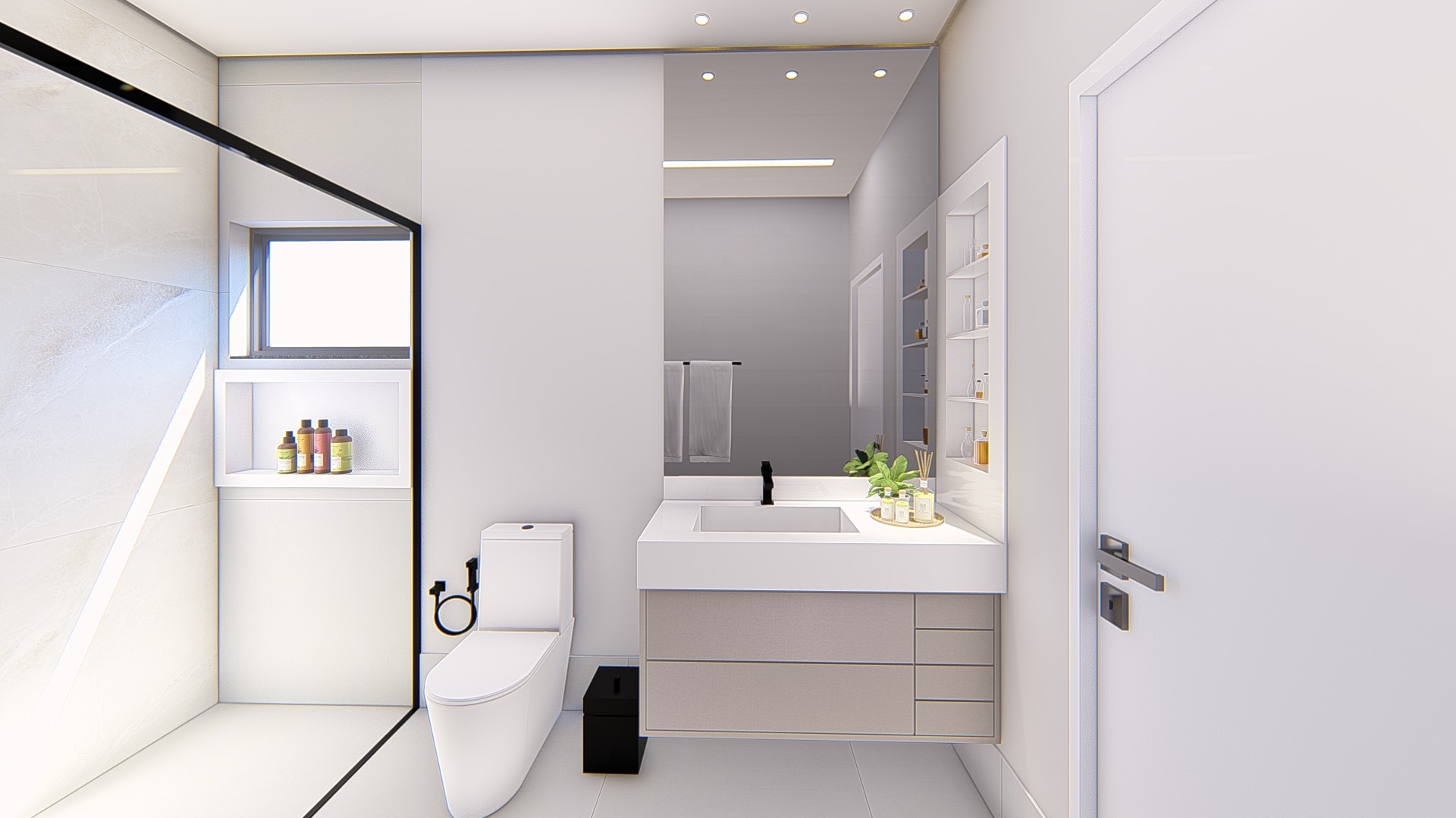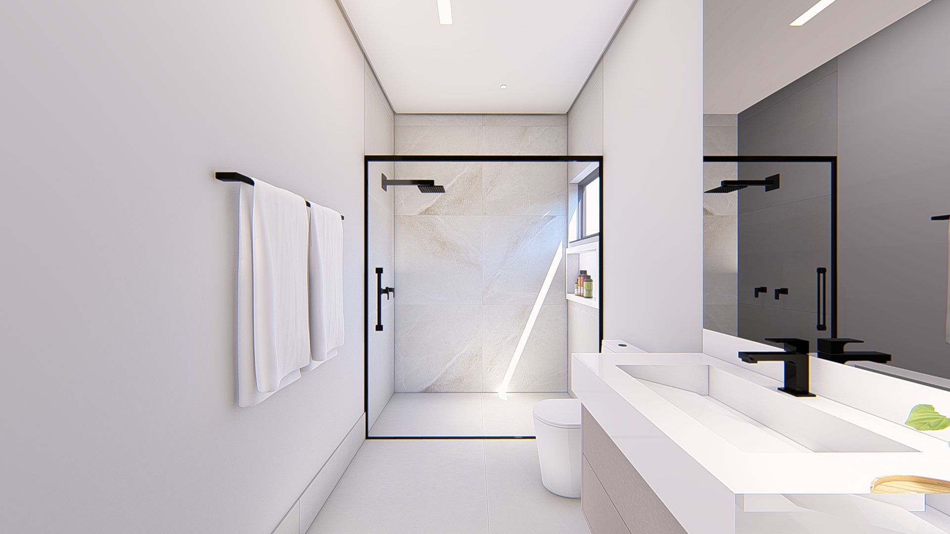 Descrição: Projeto arquitetônico e de design de interiores, incluindo detalhamentos de marcenaria, marmoraria e iluminação, para diversos ambientes da residência, como cozinha, lavabos, lavanderia, sala de TV e suítes.