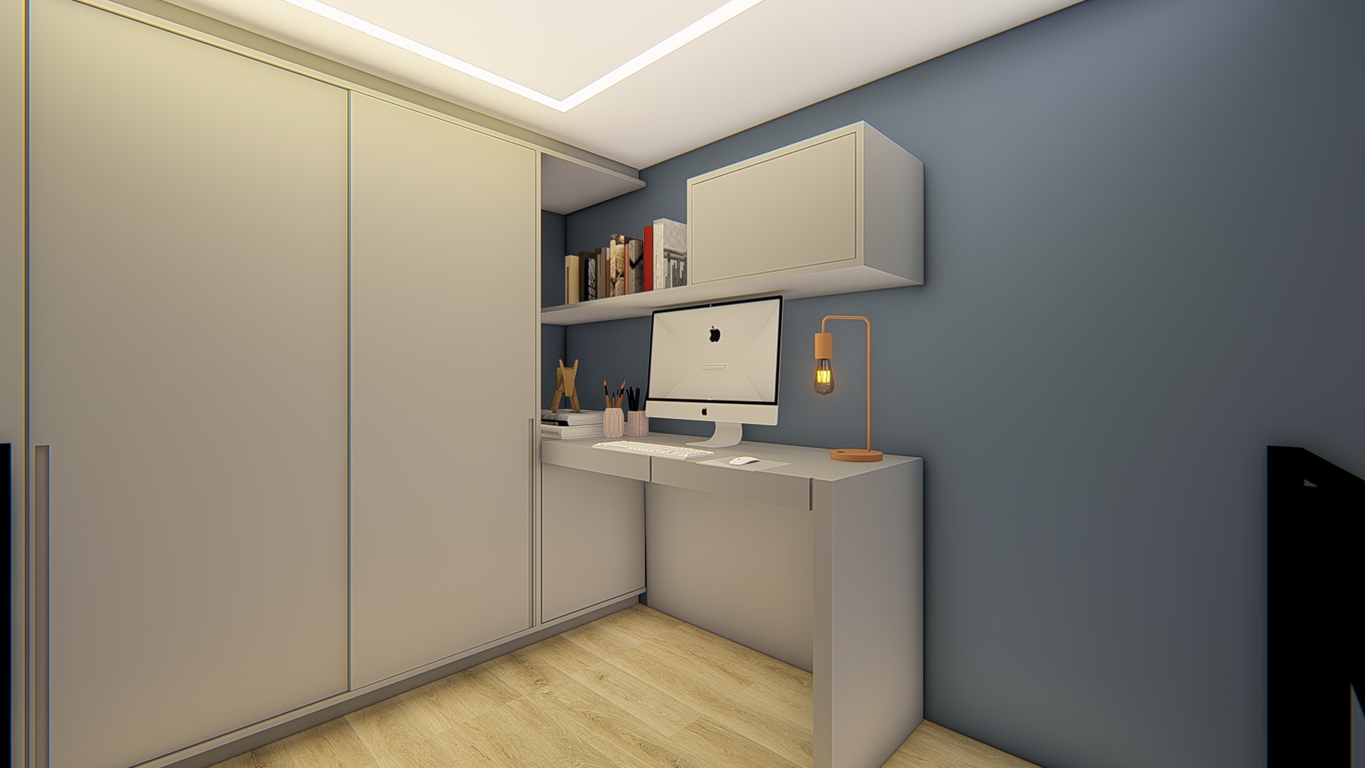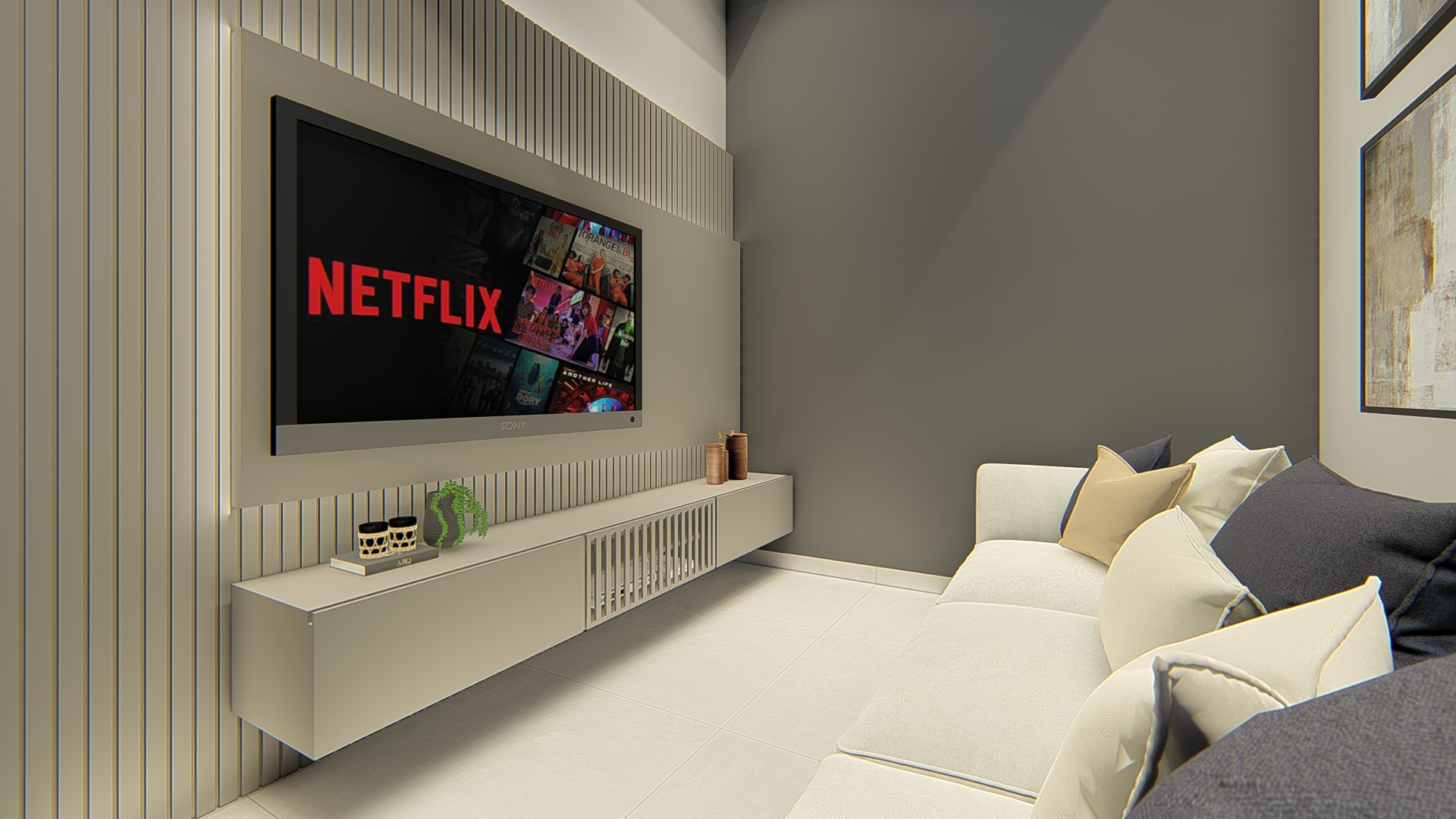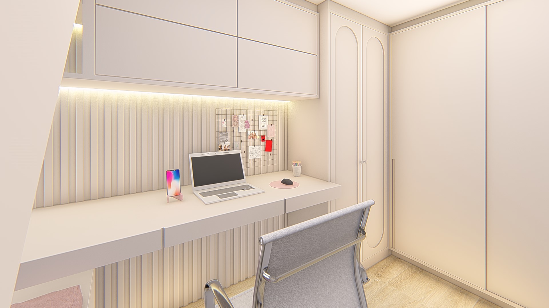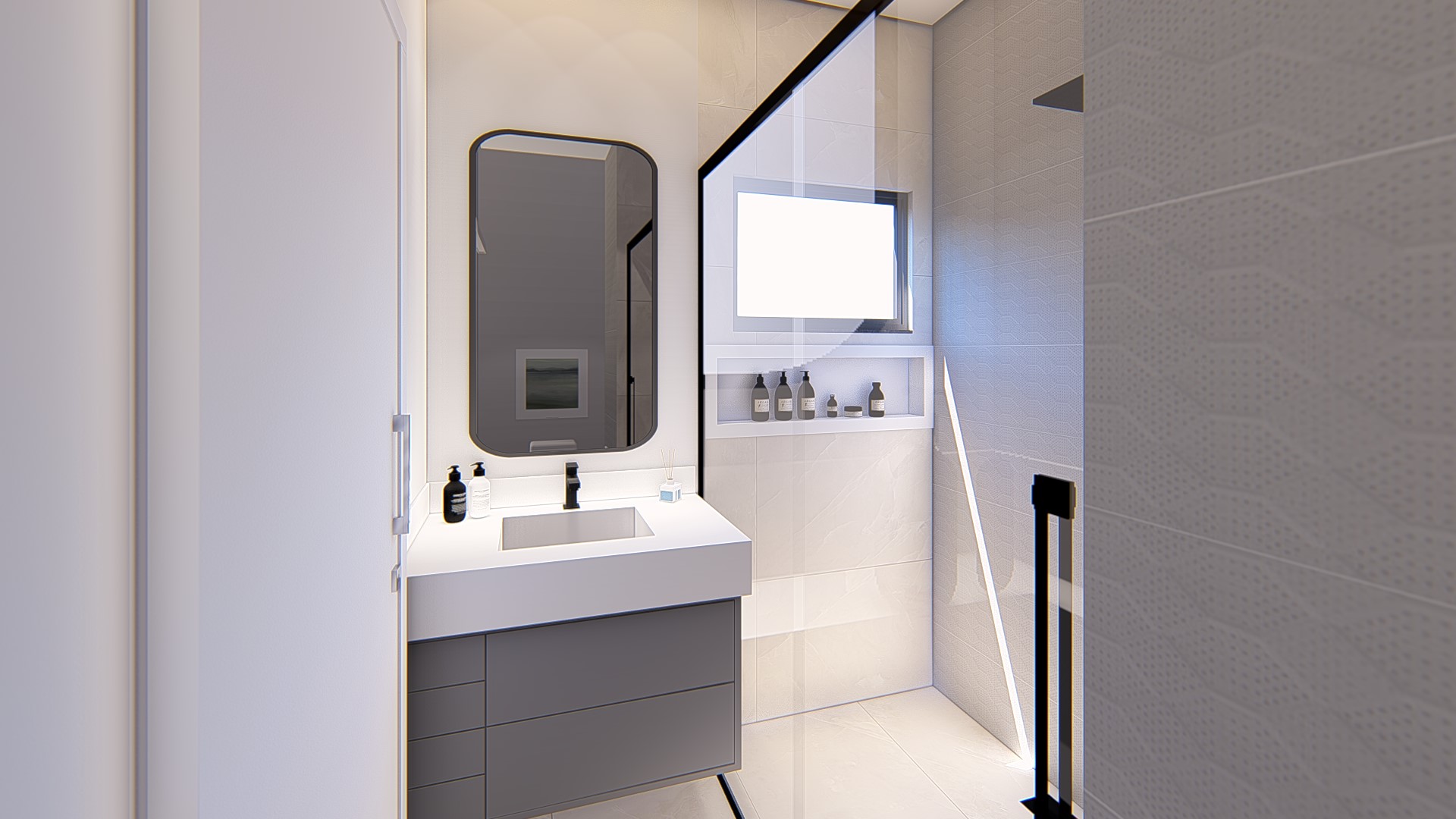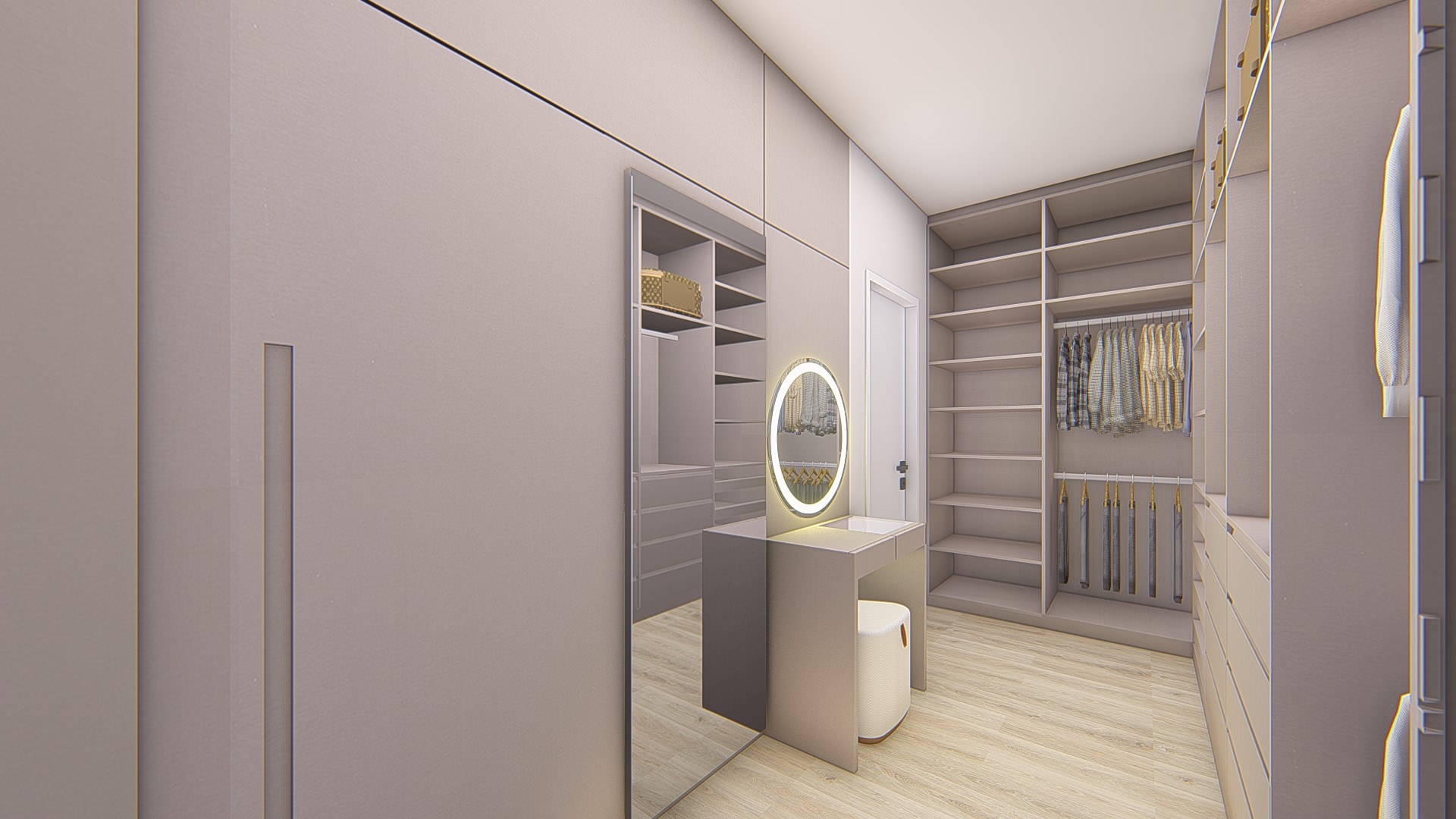 Descrição: Projeto arquitetônico e de design de interiores, incluindo detalhamentos de marcenaria, marmoraria e iluminação, para diversos ambientes da residência, como cozinha, lavabos, lavanderia, sala de TV e suítes.